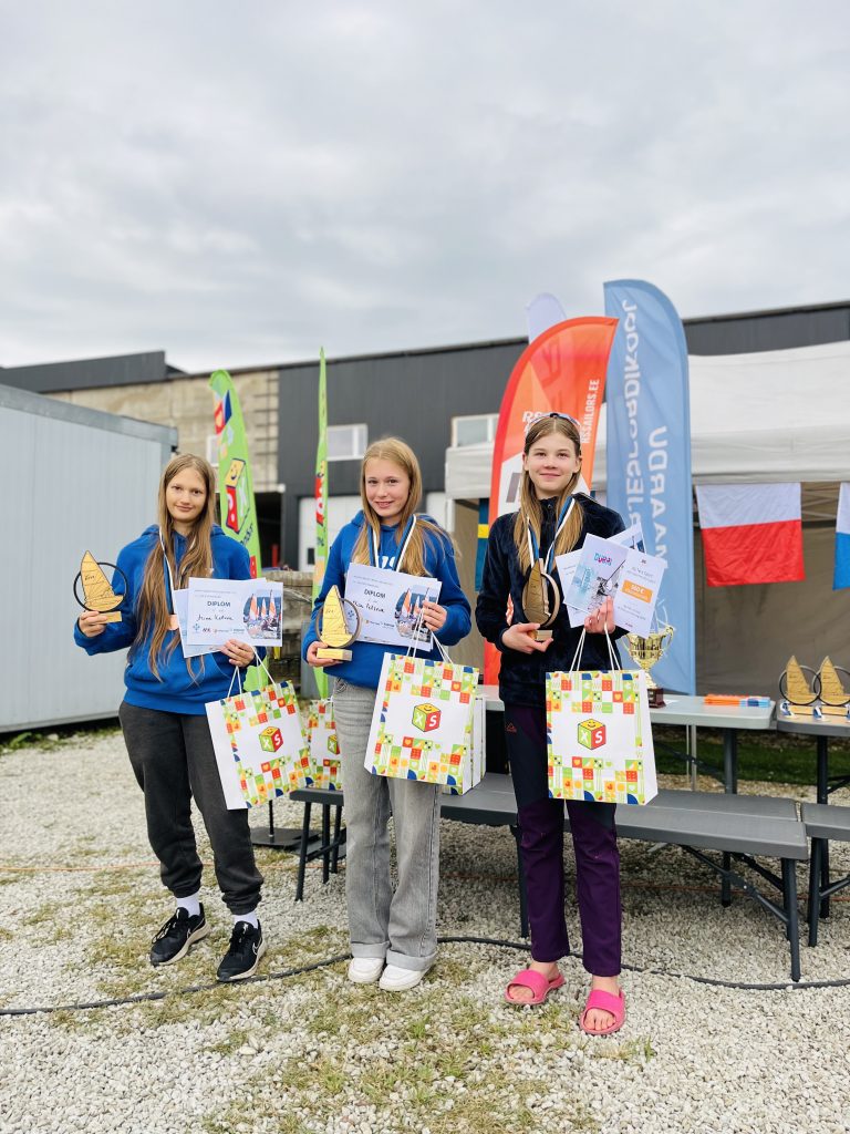 Fotol vasakult paremale: 3. koht Arina Ketova (Maardu Purjespordikool), 1. koht Alisa Petrova (Maardu Purjespordikool), 2. koht Lenna Jete Jaanus (Nõuni Purjeklubi)
